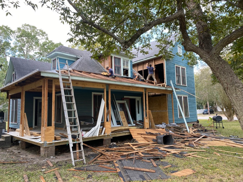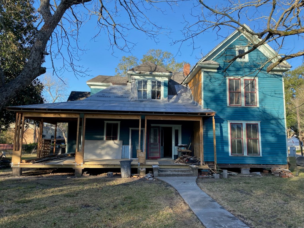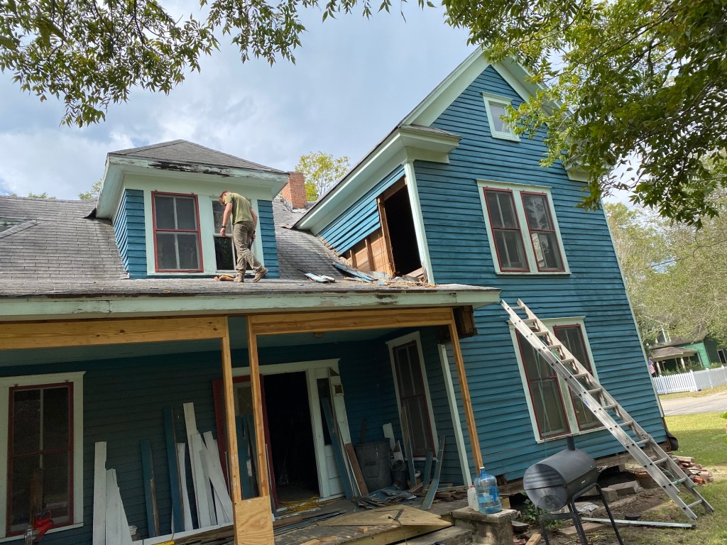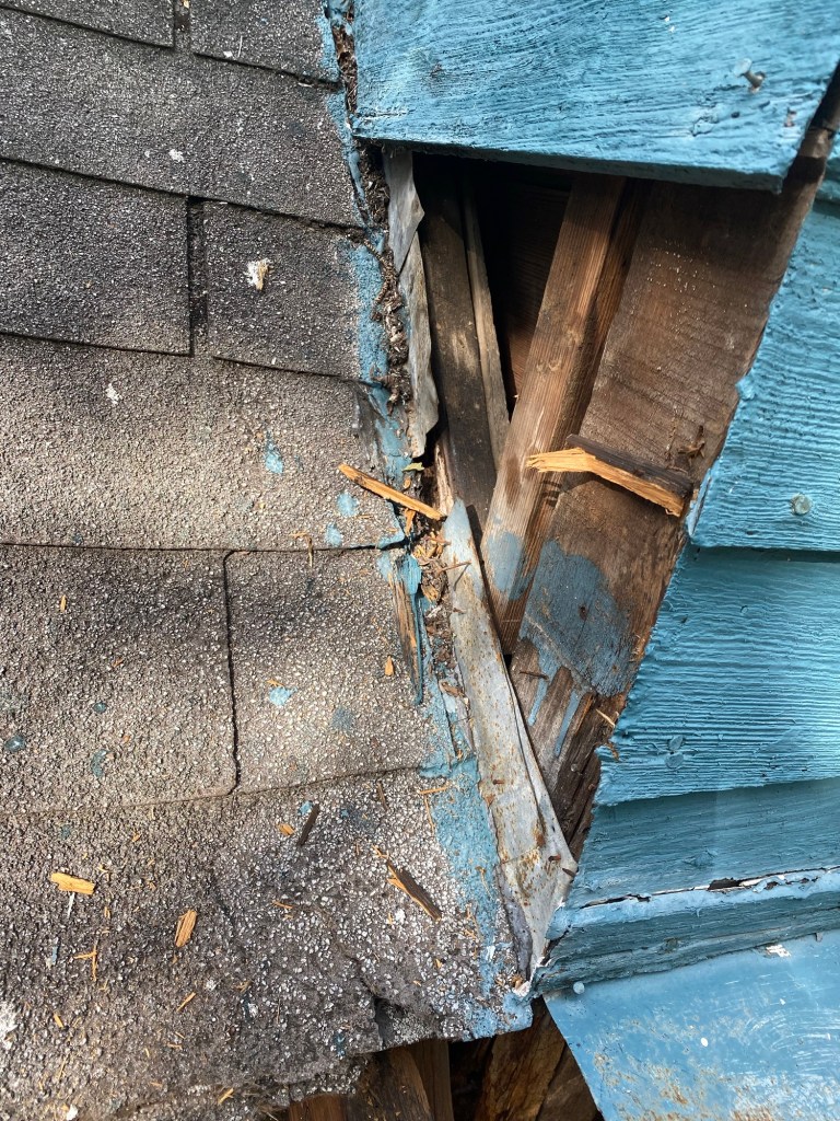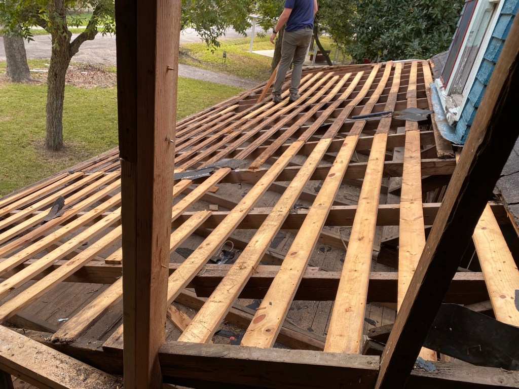 Saturday morning, J got to work tearing the front side of the porch roof off. After our helpers came, they started repairing rafters, fixing the leak on the dormer and replacing rotten boards. We also took the shiplap off the interior wall on the 2 story part to fix the rotten framing. There was a bad leak where the roof met the 2 story part. The flashing was not done right, so the water just ran inside. We took both windows out so we could repair all of the framing from the porch up to the 2nd story. For now, both windows are temporary covered with plywood so we can focus on other things.