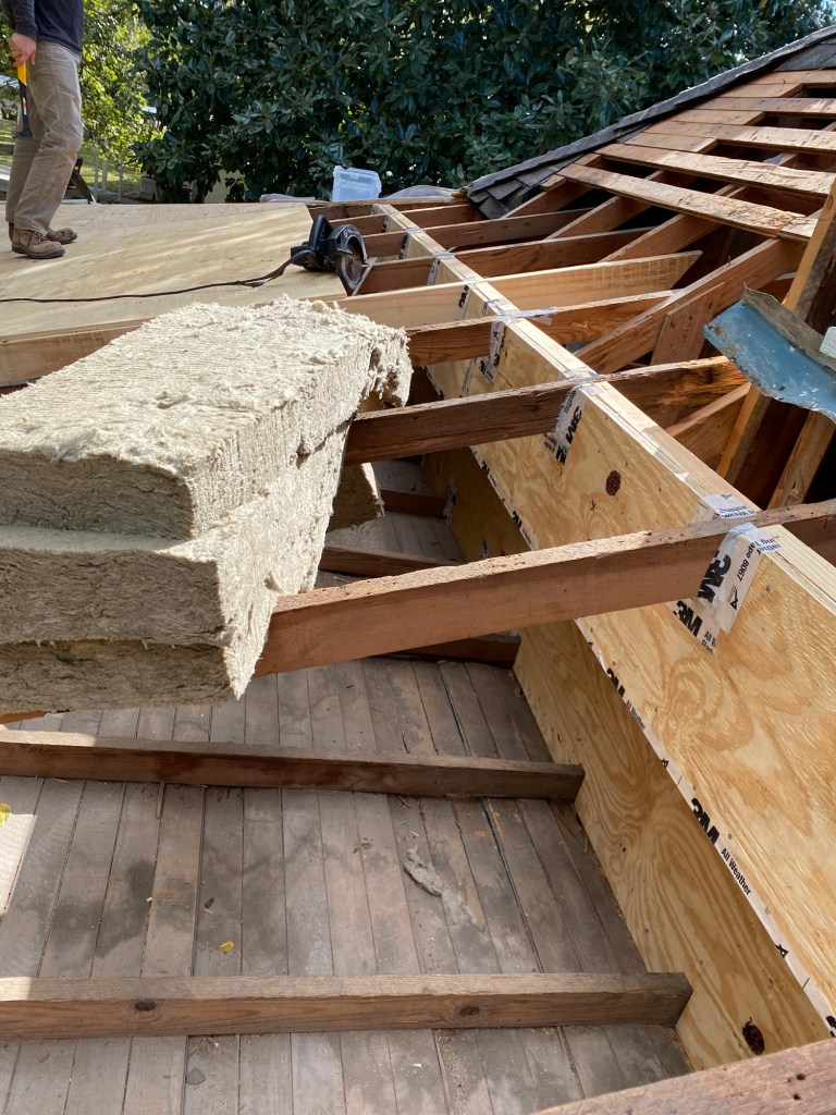 The house had no insulation anywhere, and the 1.5 story part was completely open to the porch ceiling, with huge air gaps. That makes for a super hot upstairs during the summer, and very cold in the winter! We added insulation and plywood and taped all the seams.