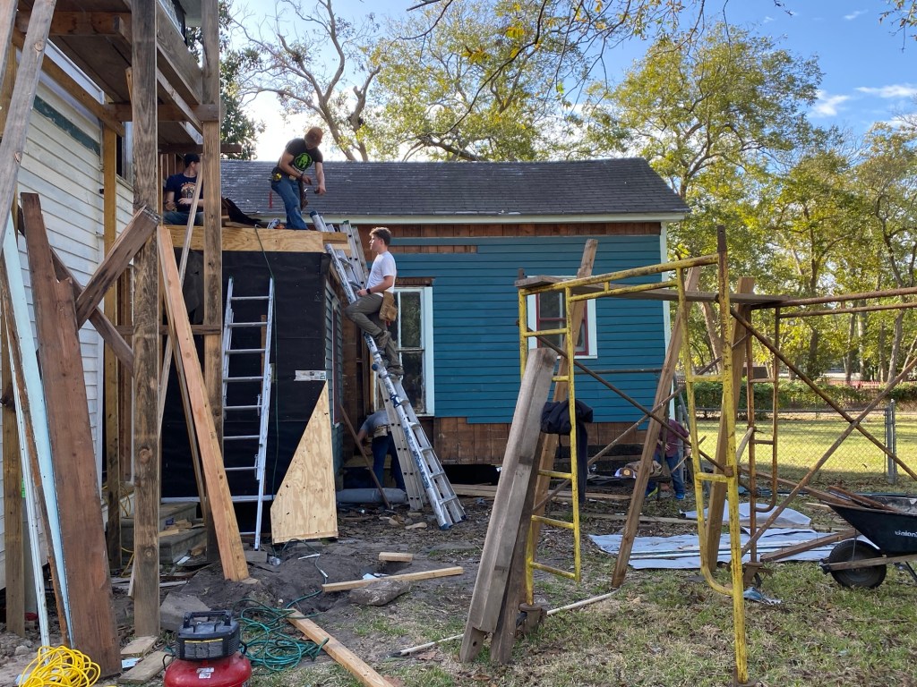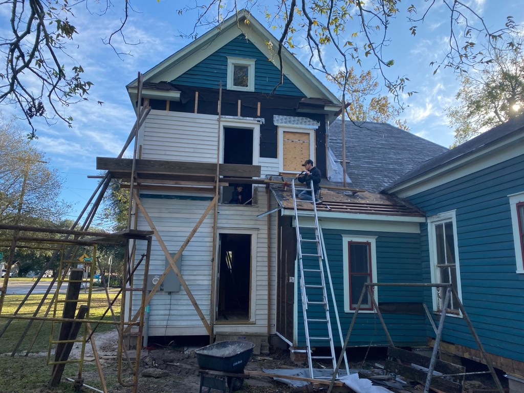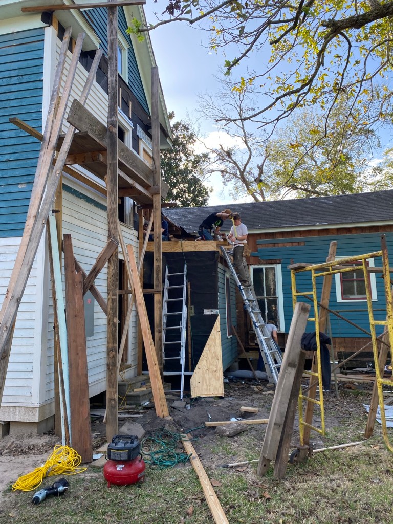 The pantry roof was the last part of the house that had a major leak. Eventually, we plan to have a 2nd story porch above this roof, so we decided to make it a flat roof right now while we were repairing it anyway. Our friend owns a roofing company, so we had a big crew helping us. We got the roof reframed and finished in 1 day. Now it’s all ready for a porch above it!