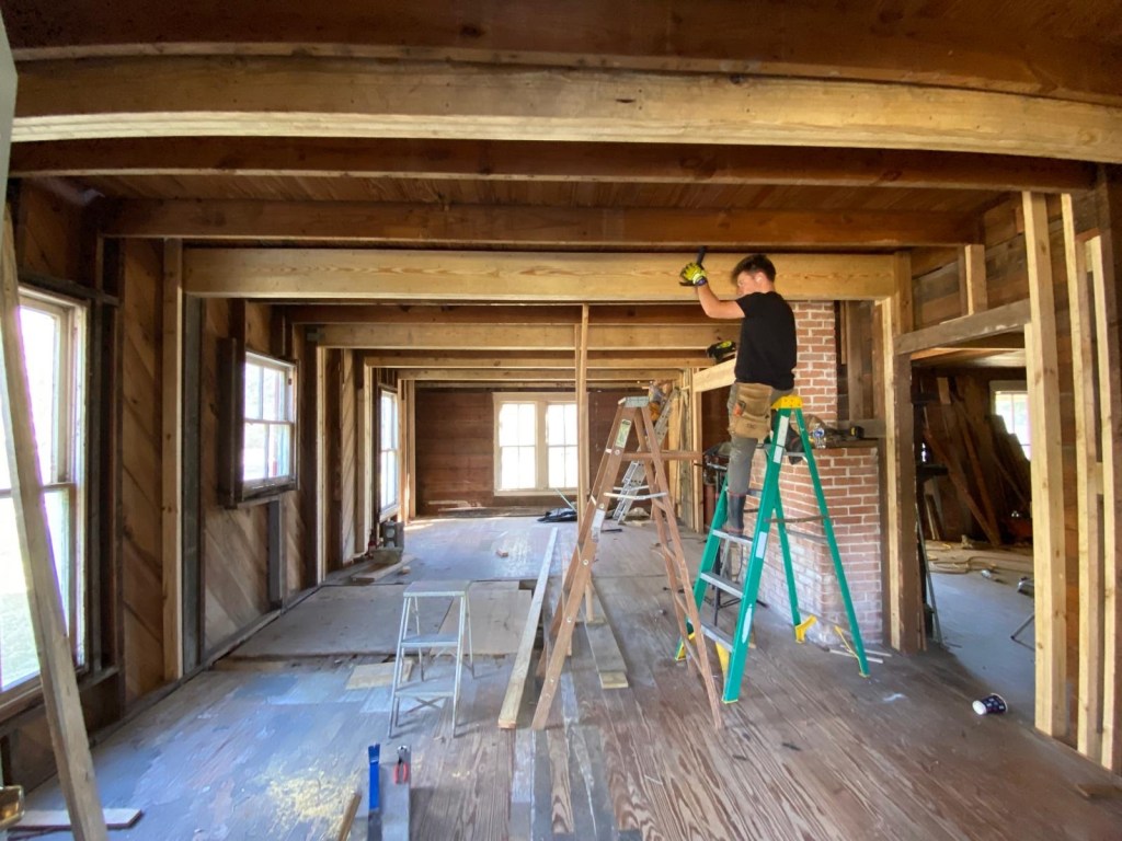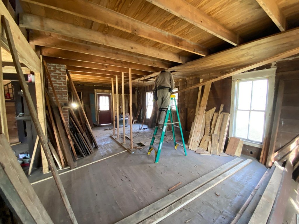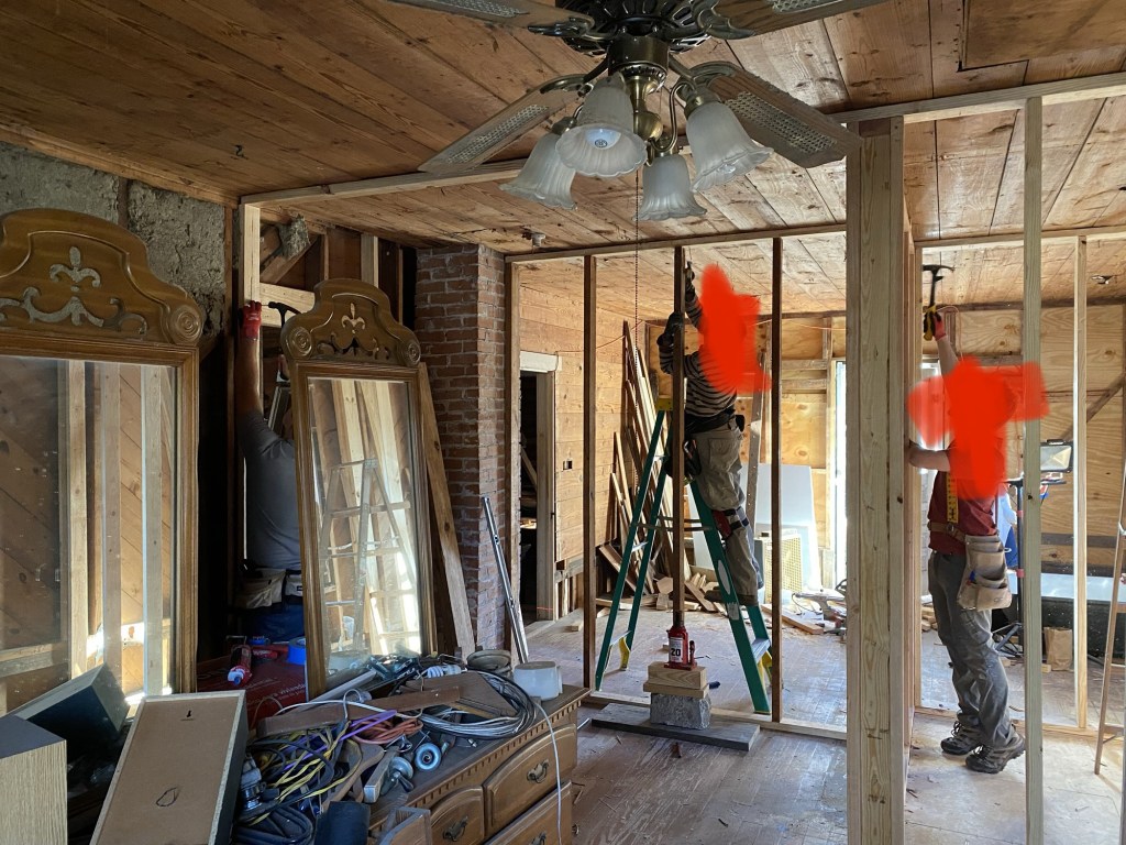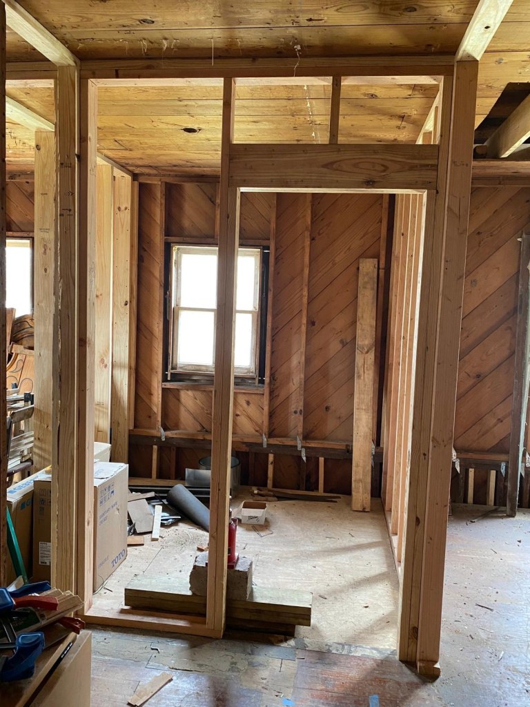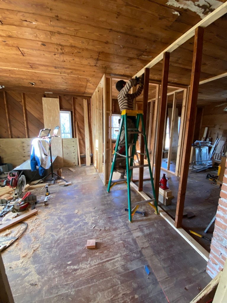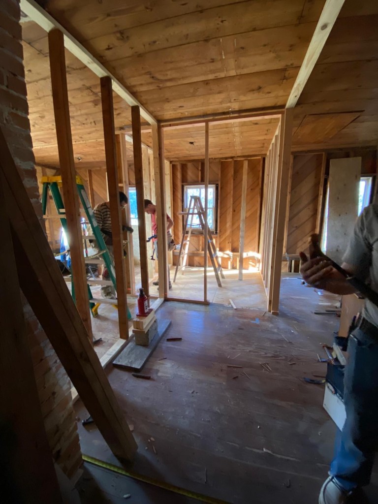 First we took all the shiplap off the ceiling and walls, and took out the old bathroom walls. We added some temporary support where the bathroom wall used to be.