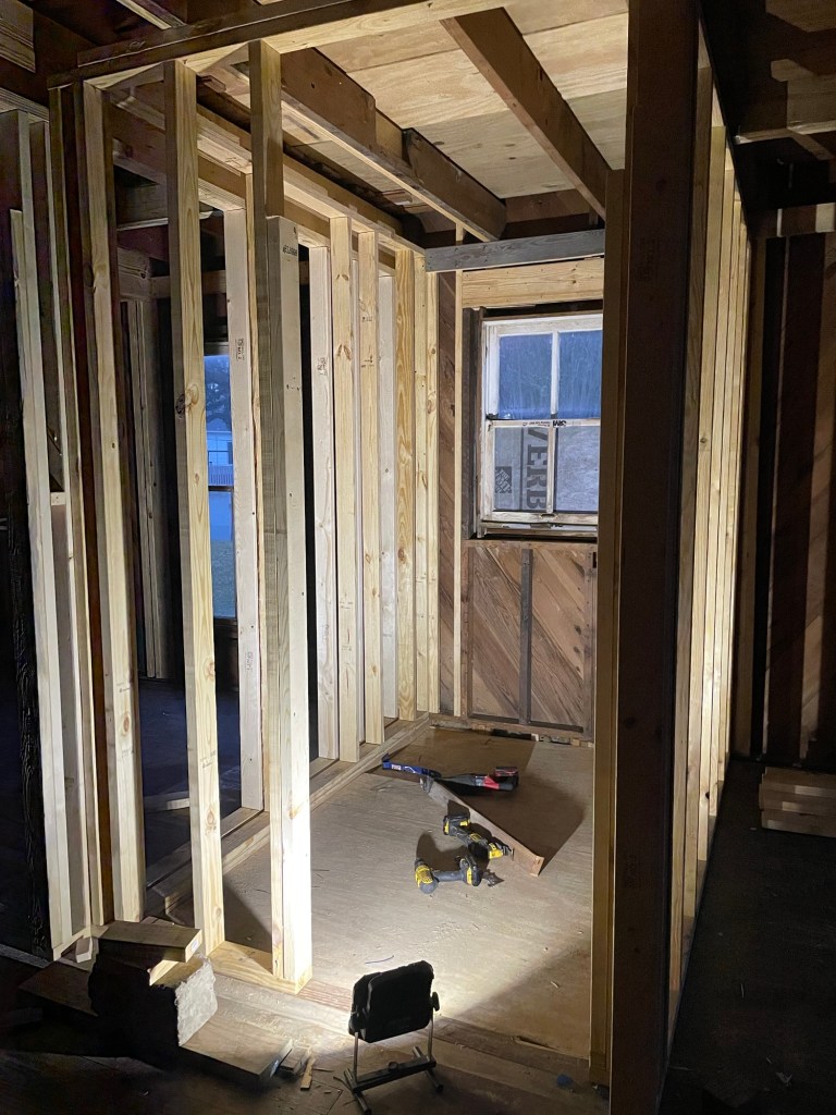 After the subfloor was installed, we started on the bathroom walls. There was other framing that had to be re-done, like the bathroom window.