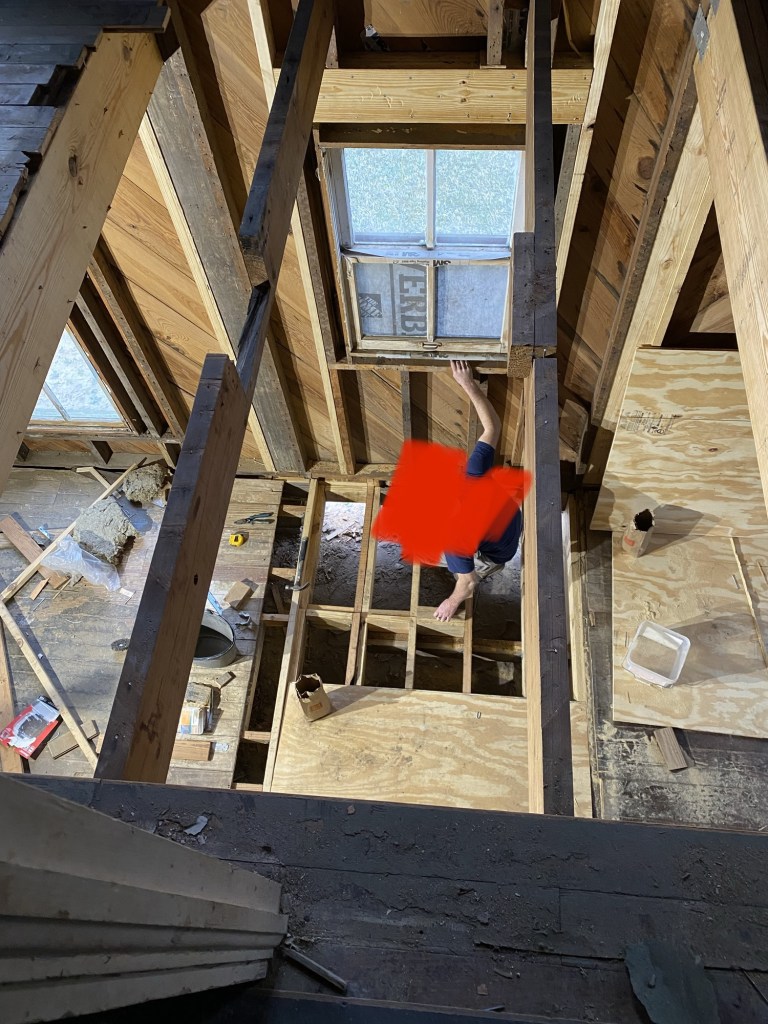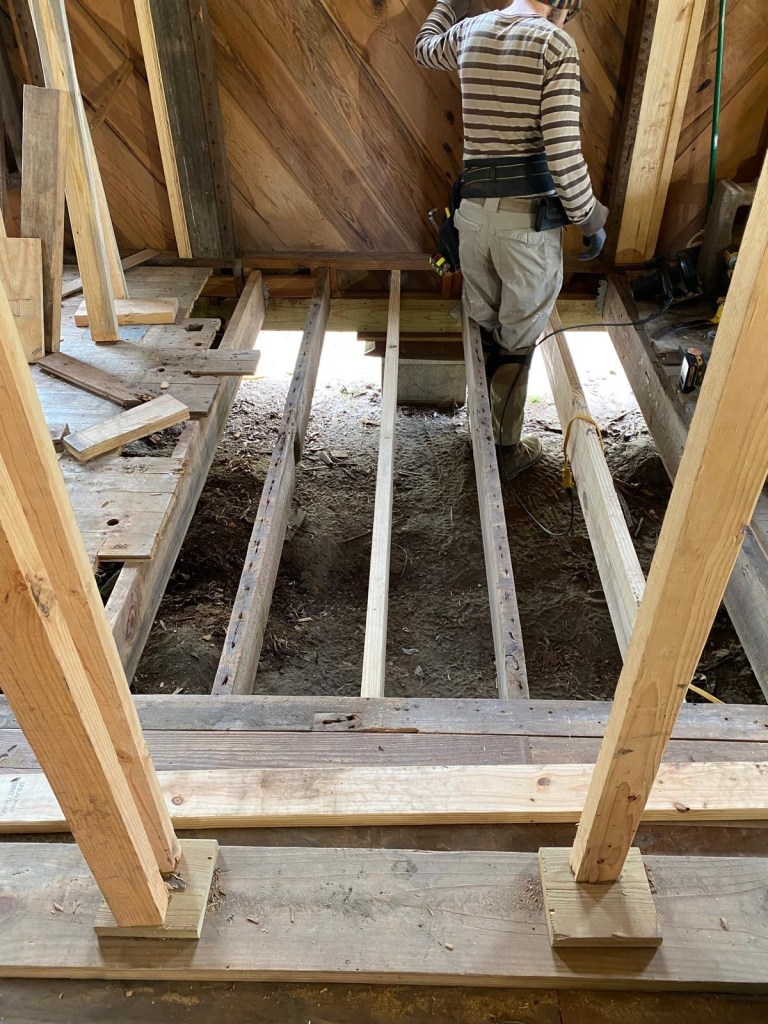 The upstairs floor was very bouncy, so we needed to reinforce it. We added 5 new beams! Each beam was made of 3-2×12’s, 15 feet long. They were HEAVY! It was fun watching this first beam go up!