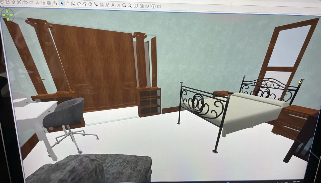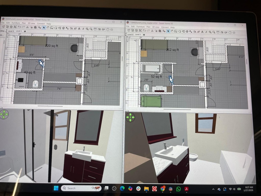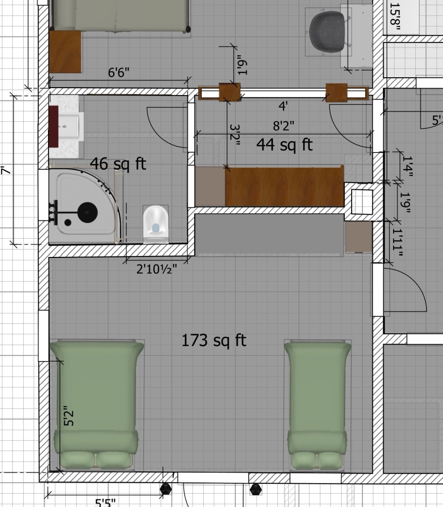 After countless drawings and 3d models, we settled on a plan that checked almost all the boxes. I was hoping to fit a tub in, but we would have had to sacrifice either wall space in the bedroom, or closet space. So, we settled on a bigger-than-average corner shower, which allowed us to keep a bedroom wall usable, and a good amount of “reach in/ built in” closets.