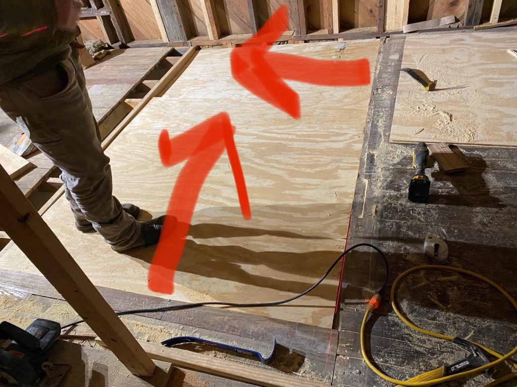 In case you’re thinking the amount of joists doesn’t add up from the last picture, you’re right. We cut the flooring back to make the bathroom 2 feet wider.