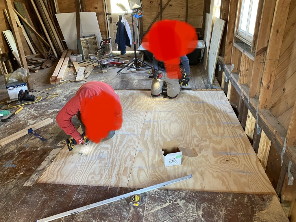 We repaired/ added new floor joists, added subfloor, and put up the new walls! This subfloor was easier because it’s not going to be a wet room, so no complicated sloping.