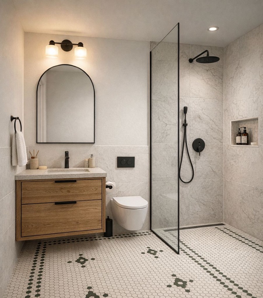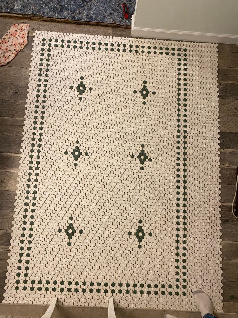 This is our tile, and the pattern we plan to do. (The AI rendition has the pattern going the wrong direction, and it’s missing a window in the shower, and a door, but you get the idea!) 🙂