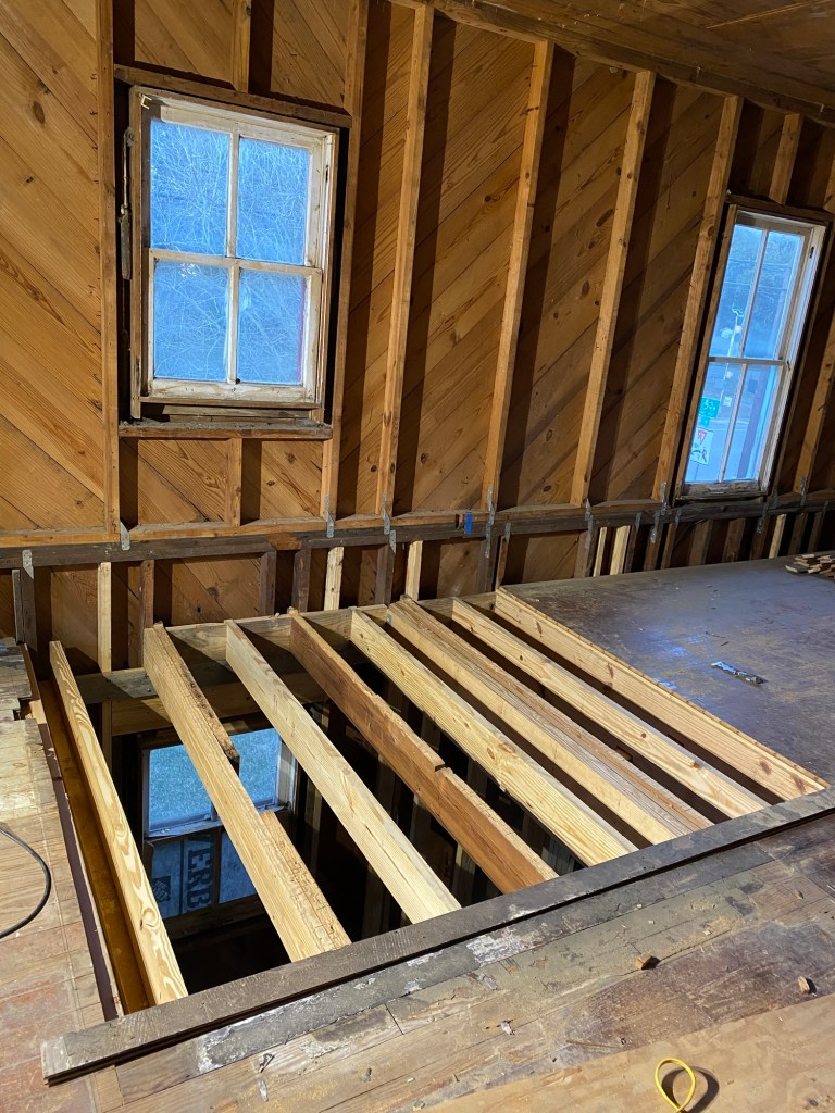 So, back to framing. First we added new floor joists. We spaced them 12” apart since this will be a tile floor.